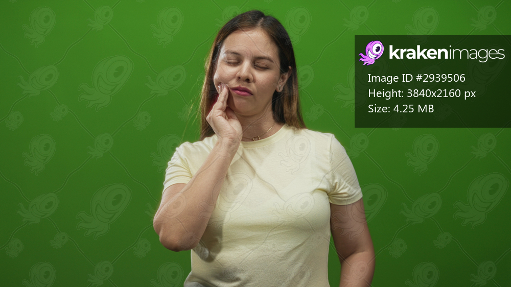 Young caucasian woman touching cheek and wincing in green studio wearing pale yellow t shirt and heart necklace; toothache pain.