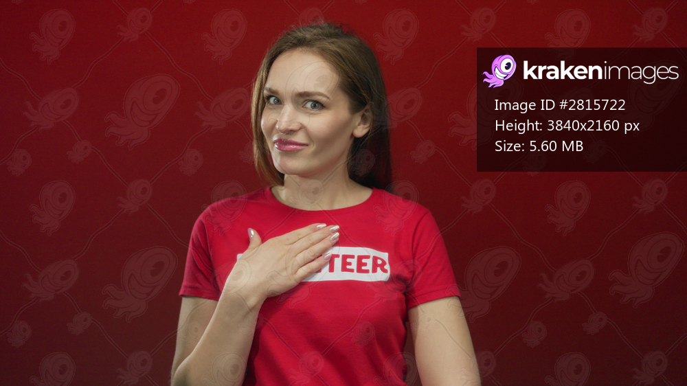Young caucasian woman volunteer touches her chest with hand and smiles in red studio; sincerity service dedication.