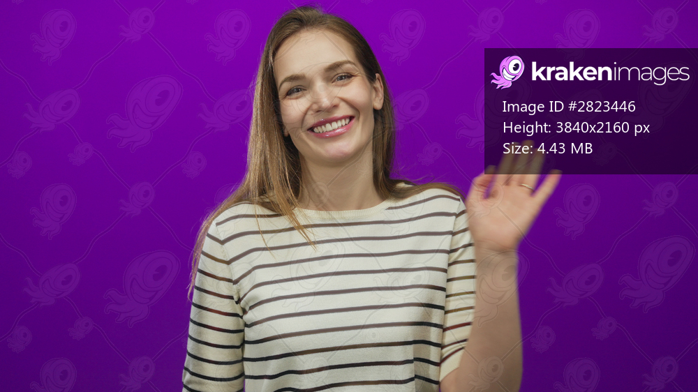 Young caucasian woman waves hand in purple studio setting with bright lighting and casual striped shirt visible; welcome happiness friendliness warmth. - Kraken Images