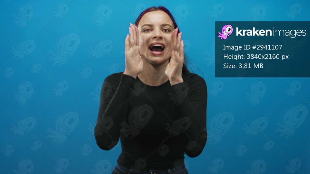 Young caucasian woman waving both hands, showing open palms and pointing to herself in a blue studio; energetic.