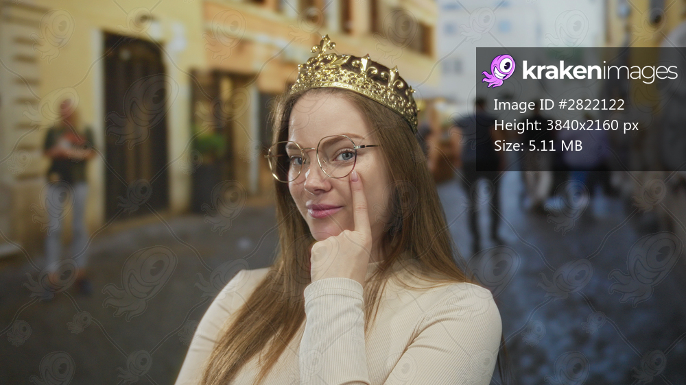 Young caucasian woman wearing a golden crown and glasses points finger to cheek in old town street; confidence.