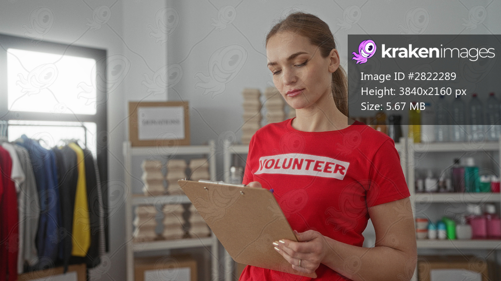 Young caucasian woman wearing a volunteer t shirt writing on clipboard in a building; service community.