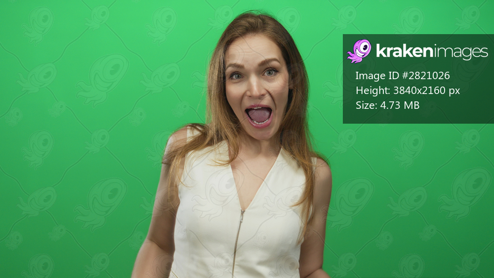 Young caucasian woman wearing a white top raising fists and flexing arms while smiling widely in green studio; excitement.