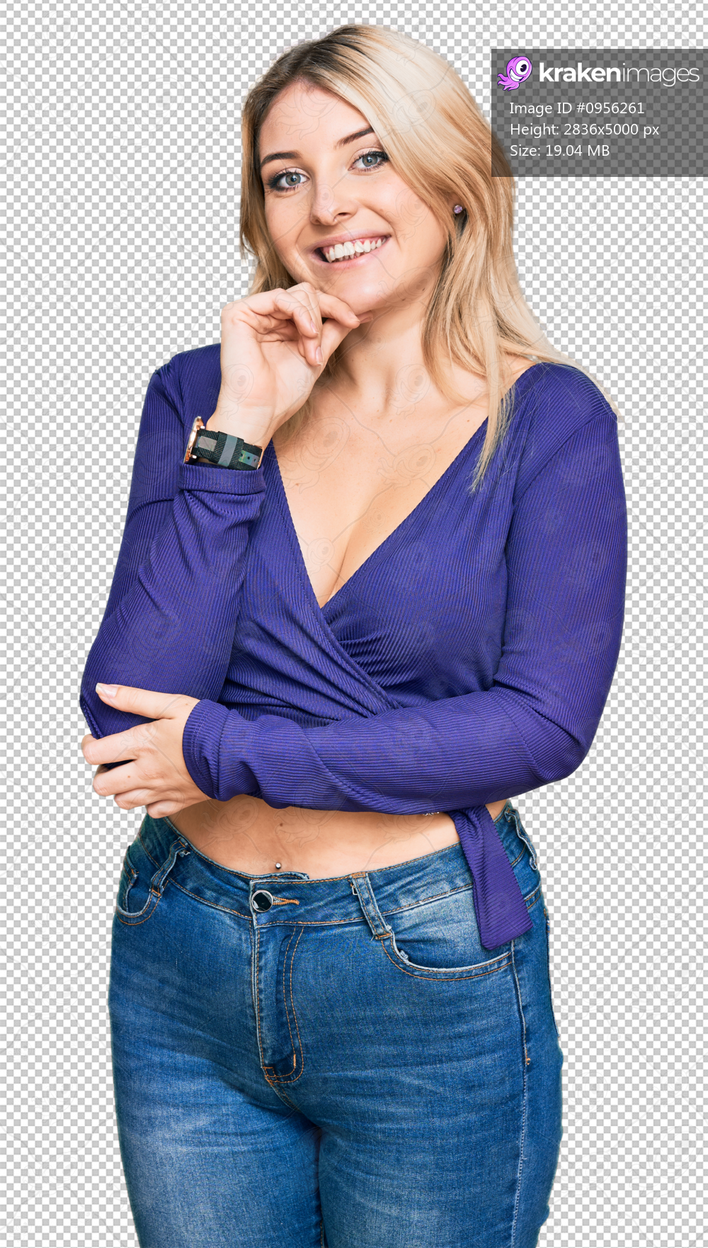 Young caucasian woman wearing casual clothes looking confident at the camera with smile with crossed arms and hand raised on chin. thinking positive.