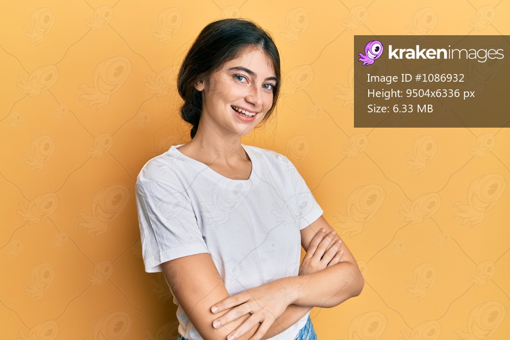 Young caucasian woman wearing casual white t shirt happy face smiling with crossed arms looking at the camera. positive person.