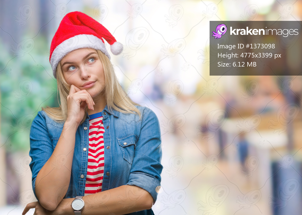 Young caucasian woman wearing christmas hat over isolated background with hand on chin thinking about question, pensive expression. Smiling with thoughtful face. Doubt concept. - Kraken Images