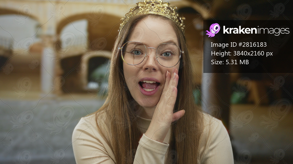 Young caucasian woman wearing crown and glasses softly covers her mouth whispering in ancient building; secrecy.