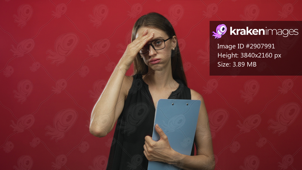 Young caucasian woman wearing glasses and a black sleeveless blouse, holding a blue clipboard and pressing her hand to her forehead in studio against a red wall; stress. - Kraken Images