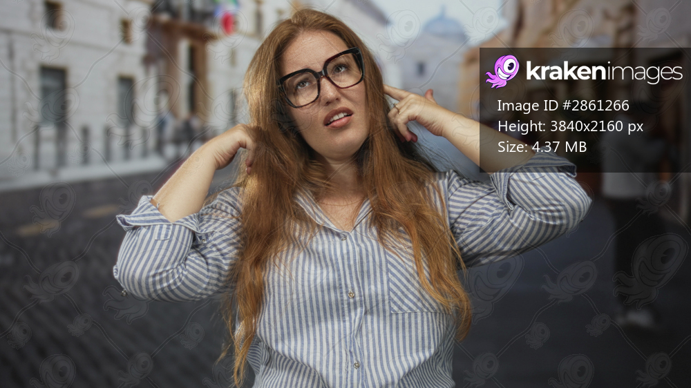 Young caucasian woman wearing glasses covers ears with both hands on street; sensory overload stress.