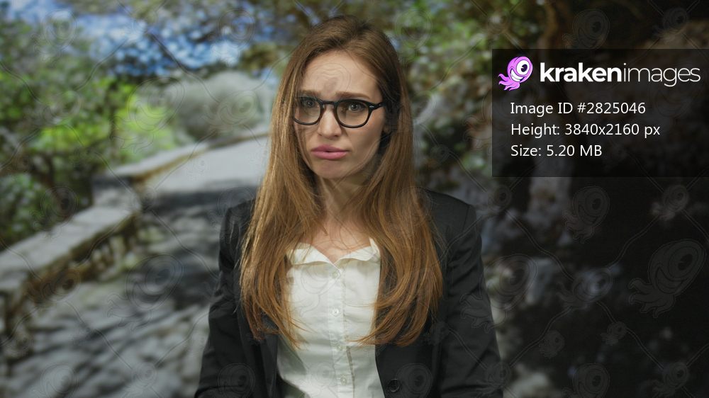 Young caucasian woman wearing glasses frowning with forehead wrinkles on forest trail under dappled sunlight; uncertainty.