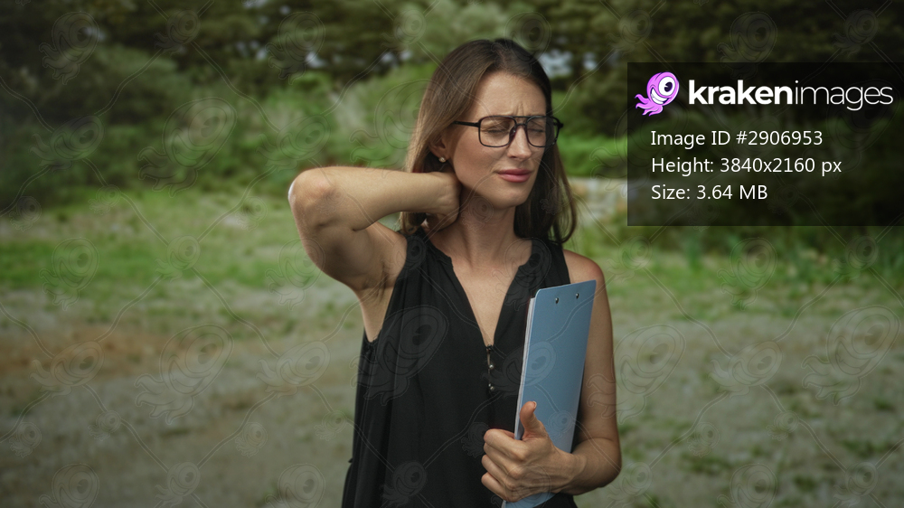 Young caucasian woman wearing glasses holding clipboard with hand on neck in forest with visible neckache; work stress discomfort.