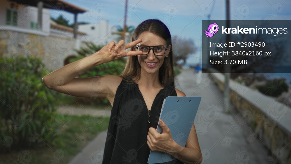 Young caucasian woman wearing glasses holds a clipboard and shows a two finger peace sign toward camera on a coastal street; playful confidence.
