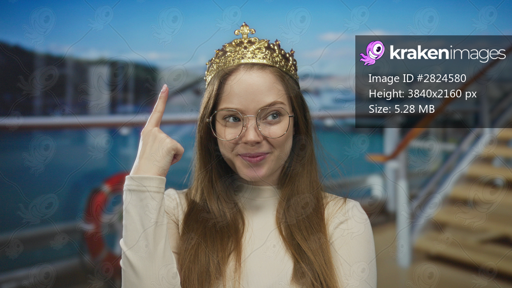 Young caucasian woman wearing glasses points finger to crown on boat deck under clear sky; royal confidence.