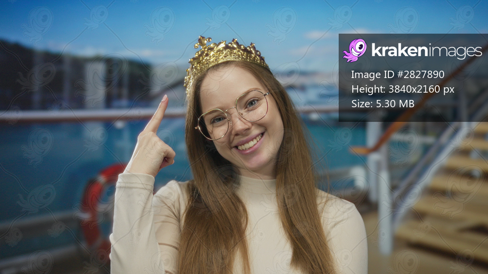 Young caucasian woman wearing glasses points finger to crown on boat deck under clear sky; royal confidence.