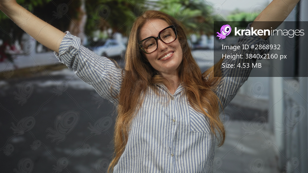 Young caucasian woman wearing glasses raising fists while dancing on sunlit street between parked cars; joy.