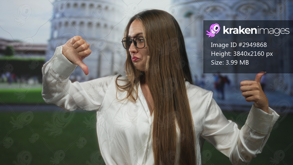 Young caucasian woman wearing glasses and white blouse showing thumbs up and thumbs down at the leaning tower of pisa building outdoors; playful ambivalence. - Kraken Images