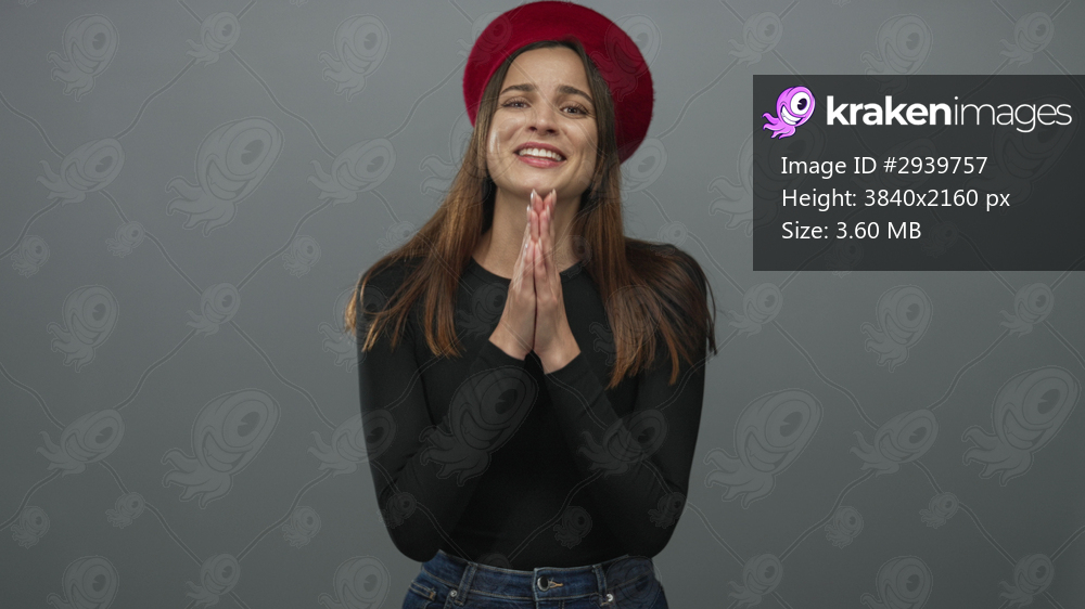 Young caucasian woman wearing red beret and black top clasping hands in prayer in a gray studio; hopeful plea.