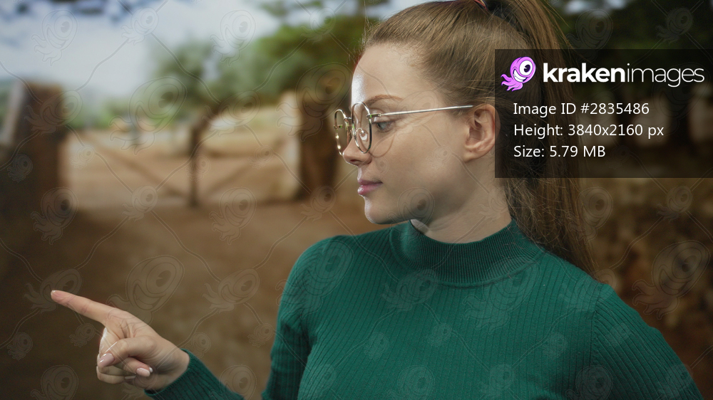 Young caucasian woman wearing round glasses and green sweater points finger in forest; exploration direction curiosity.