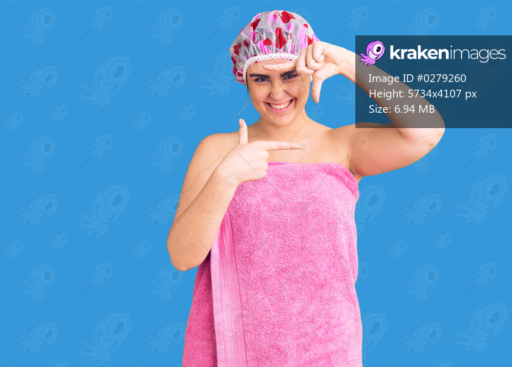 Young caucasian woman wearing shower cap and towel smiling making frame with hands and fingers with happy face. creativity and photography concept.