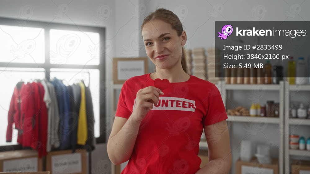 Young caucasian woman wearing volunteer shirt holding red heart with hands in building filled with donated supplies; compassion.