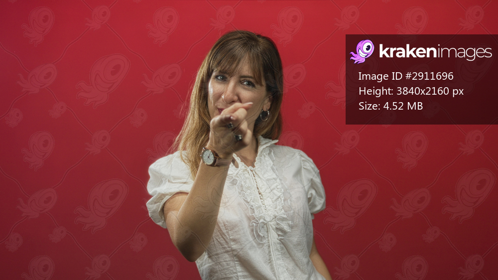 Young caucasian woman wearing white blouse smiling and giving double thumbs up with hands forward in red studio; genuine happiness approval.