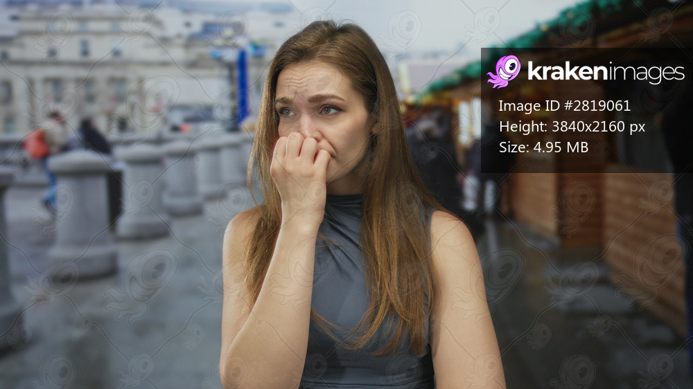 Young caucasian woman wiping tears with hand over eye in a busy street market lined with wooden souvenir stalls; sadness.