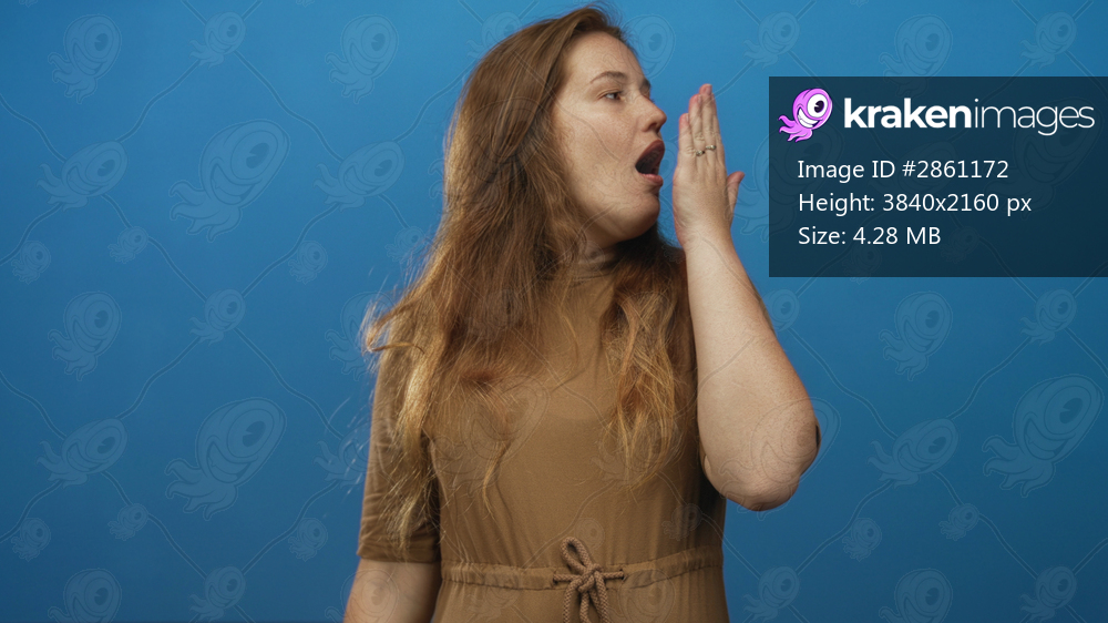 Young caucasian woman yawns while covering mouth with hand in blue studio; fatigue sleepiness drowsiness tiredness.