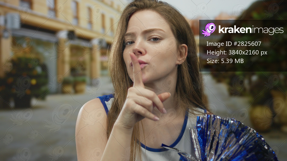 Young cheerleader woman with blue pom pom gestures finger to lips for silence on urban street; silence hush.