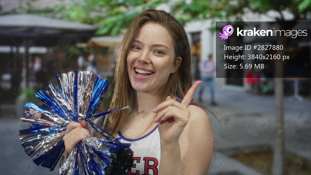 Young cheerleader woman holding blue metallic pompom points finger and smiles widely on street; enthusiasm.