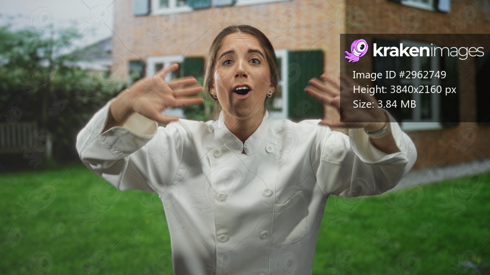 Young chef woman raises both hands and waves, smiling in a white chef coat outside a brick building with green shutters and a lawn; joy celebration warmth. - Kraken Images