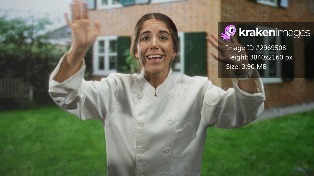 Young chef woman raises both hands and waves, smiling in a white chef coat outside a brick building with green shutters and a lawn; joy celebration warmth. - Kraken Images