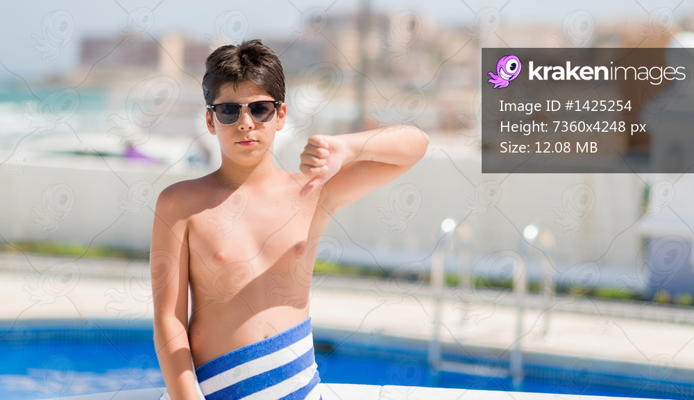 Young child on holiday at the swimming pool by the beach with angry face, negative sign showing dislike with thumbs down, rejection concept