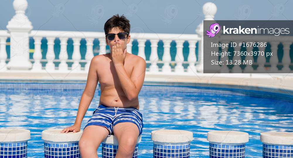 Young child on holiday at the swimming pool by the beach cover mouth with hand shocked with shame for mistake, expression of fear, scared in silence, secret concept - Kraken Images