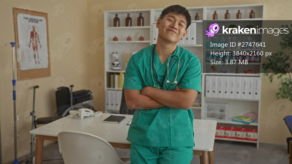 Young chinese doctor in green scrubs with arms crossed in a clinical room adorned with medical supplies, conveying a professional yet relaxed atmosphere. - Kraken Images