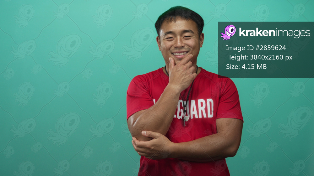 Young chinese lifeguard man in red shirt with lifeguard print and whistle holds chin in studio with green wall; contemplation.