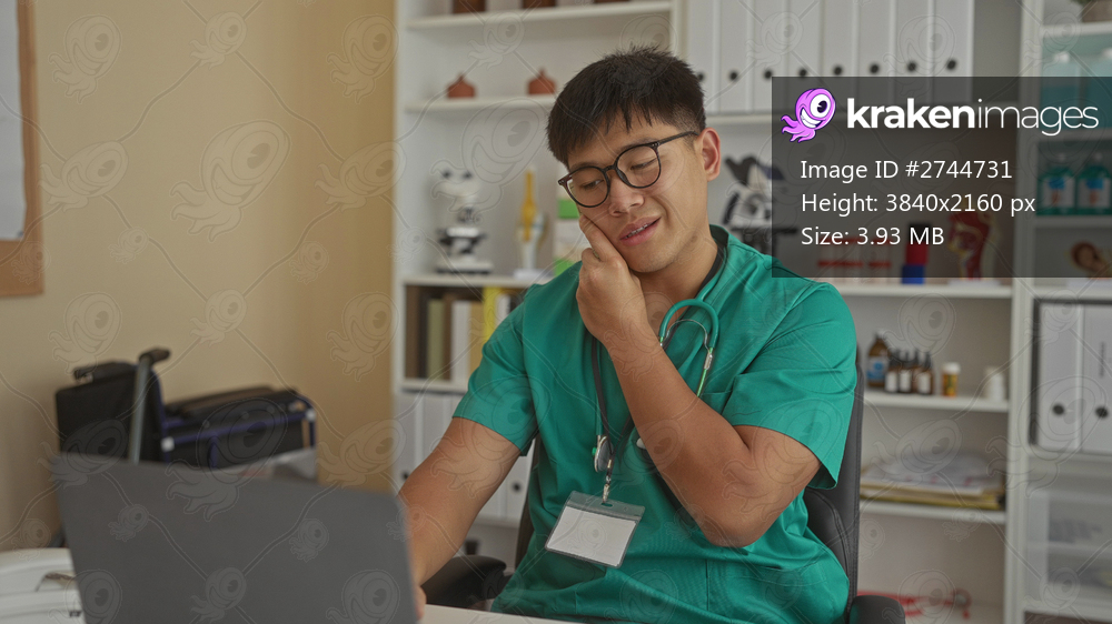 Young chinese male doctor in clinic room wearing green scrubs, using a laptop and phone with medical equipment in the background, focused on communication. - Kraken Images