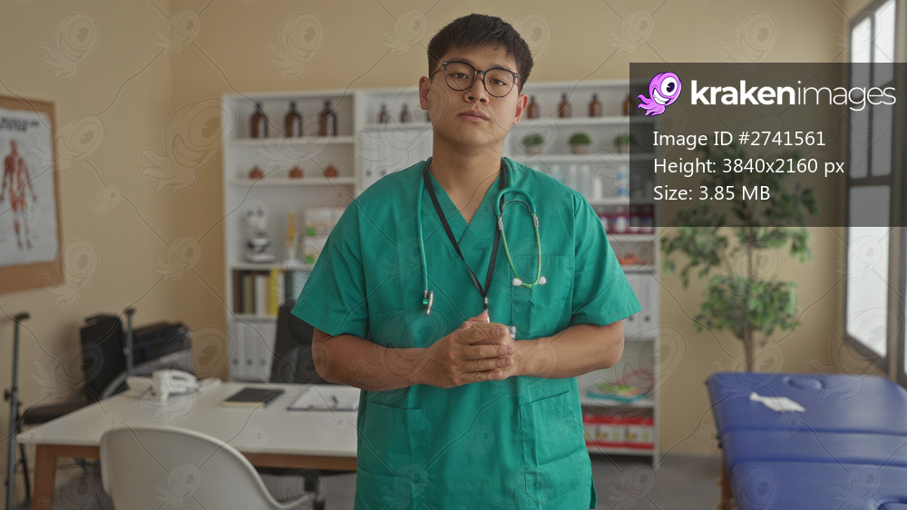 Young chinese male doctor in green scrubs with stethoscope standing confidently in a hospital clinic room, showcasing a professional medical environment. - Kraken Images