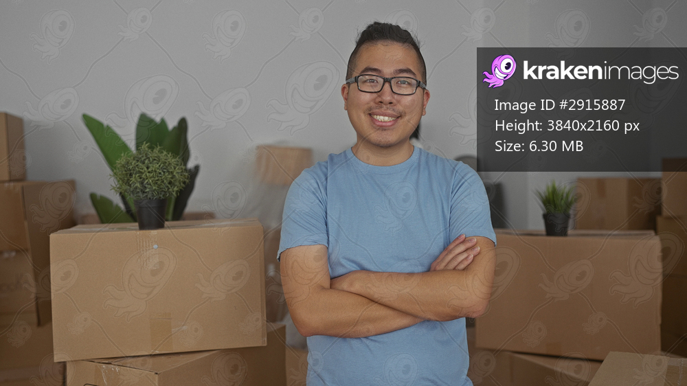 Young chinese man with arms crossed beside stacked cardboard boxes in building during move; moving day contentment.