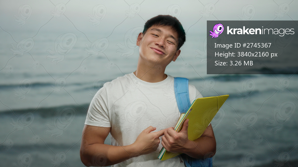 Young chinese man with backpack and folders gives a thumbs up while smiling on a beach, conveying positivity and success in an outdoor seaside setting. - Kraken Images