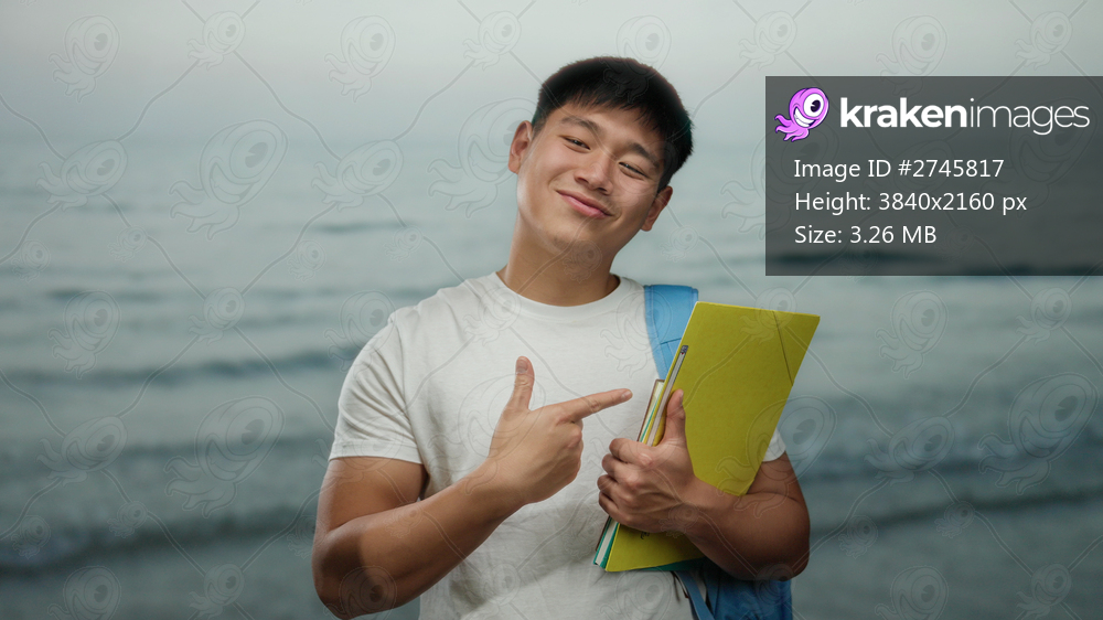 Young chinese man with backpack and folders gives a thumbs up while smiling on a beach, conveying positivity and success in an outdoor seaside setting. - Kraken Images