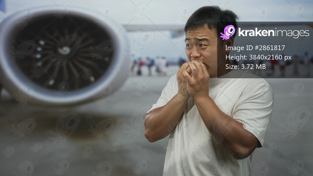 Young chinese man biting nails in front of a jet engine at busy airport terminal with blurred travelers in background; anxiety.