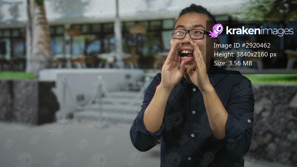 Young chinese man cupping hands to mouth shouting on a city street in front of cafe building, glasses visible; urgent announcement.
