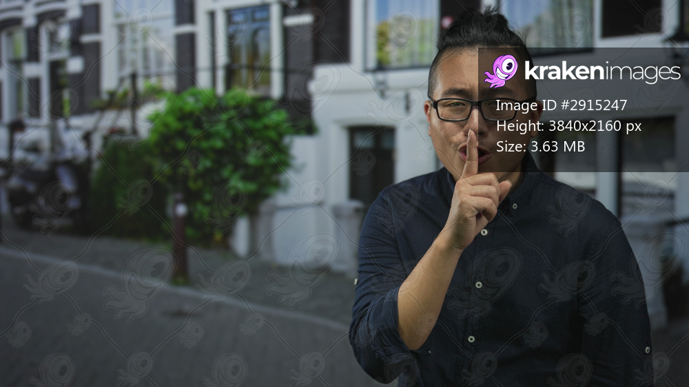 Young chinese man finger to lips for silence on cobblestone city street by white row buildings; secret hush quiet.