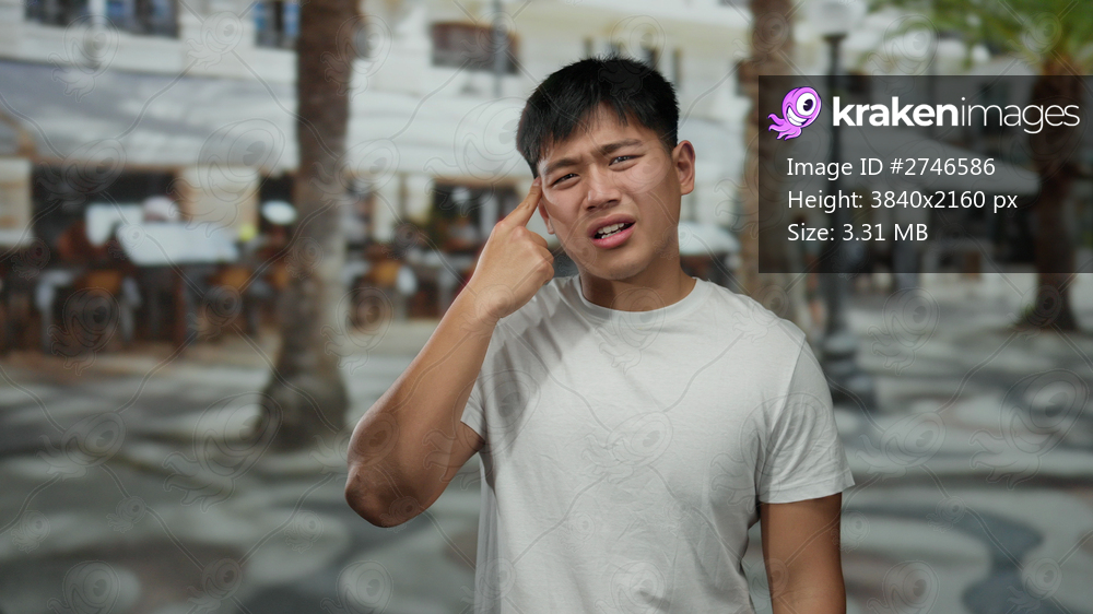 Young chinese man gesturing wildly on an outdoor restaurant terrace, creating a lively scene in a bustling coffee shop environment with palm trees in the background. - Kraken Images