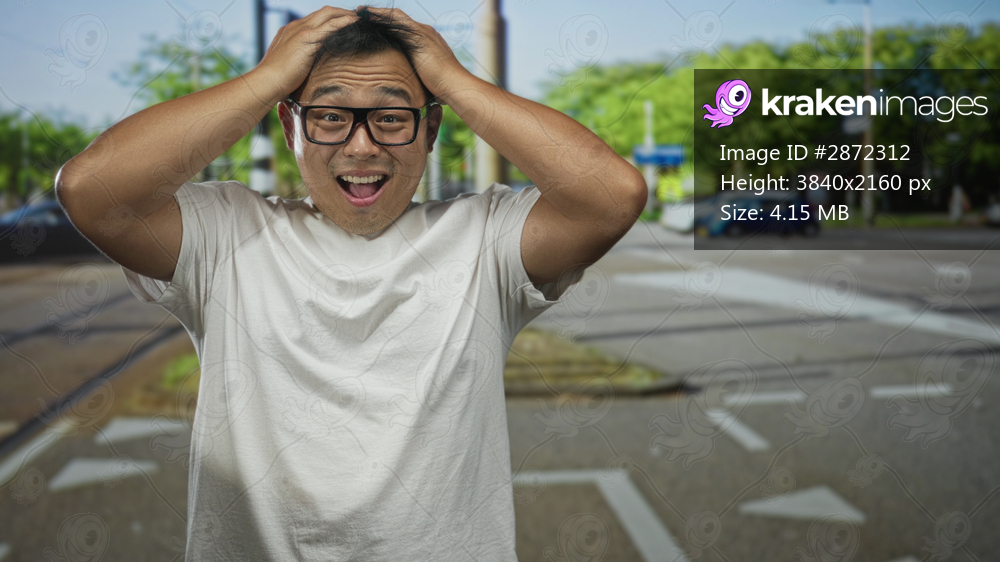 Young chinese man with glasses clutches head and pumps fists with broad smile on busy city street in daylight; excitement.