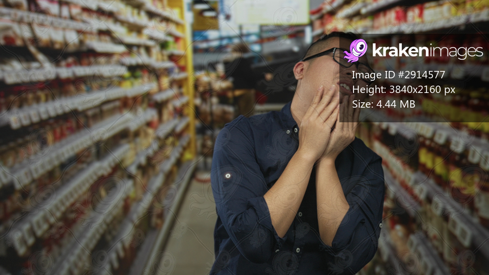 Young chinese man with glasses holding head and hand on cheek for toothache in supermarket aisle between stocked shelves and jars; discomfort.