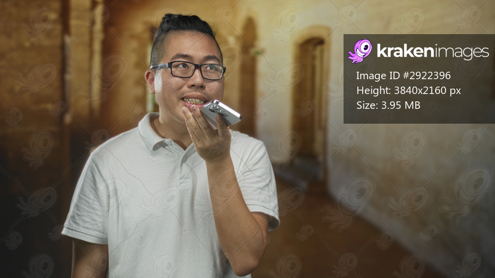 Young chinese man with glasses holds phone to mouth on old town street speaking into device while looking up; curiosity connection.