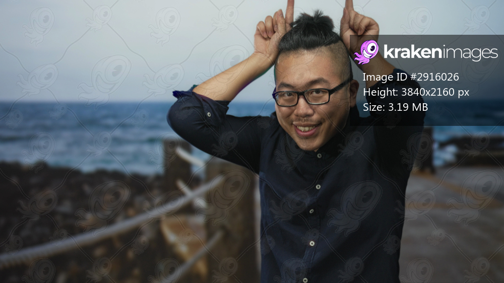 Young chinese man with glasses makes horns gesture with hands on head on a street promenade by the sea; playful.