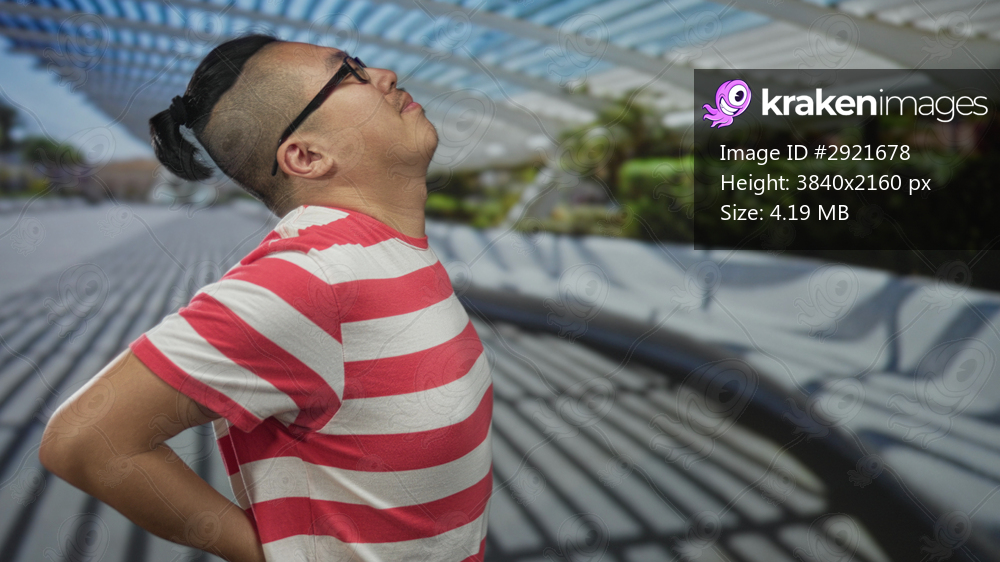 Young chinese man with glasses and manbun wearing red striped shirt leaning forward and holding lower back for backache on street under louvered canopy; discomfort. - Kraken Images