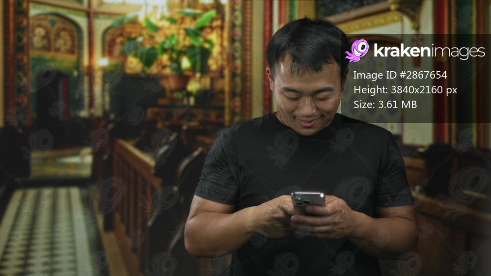 Young chinese man holds smartphone while reading messages and smiles inside ornate church building; serenity.